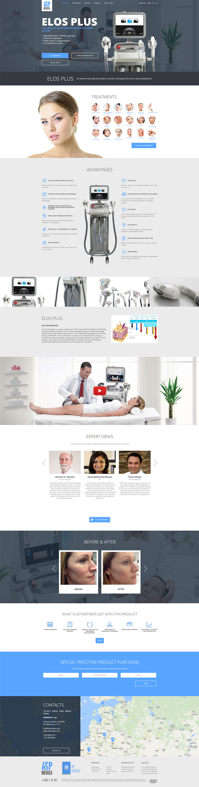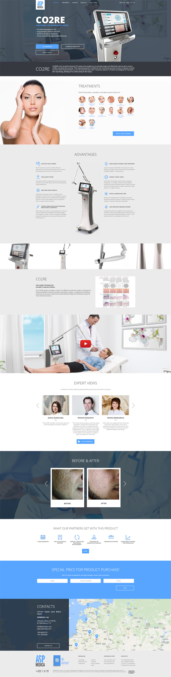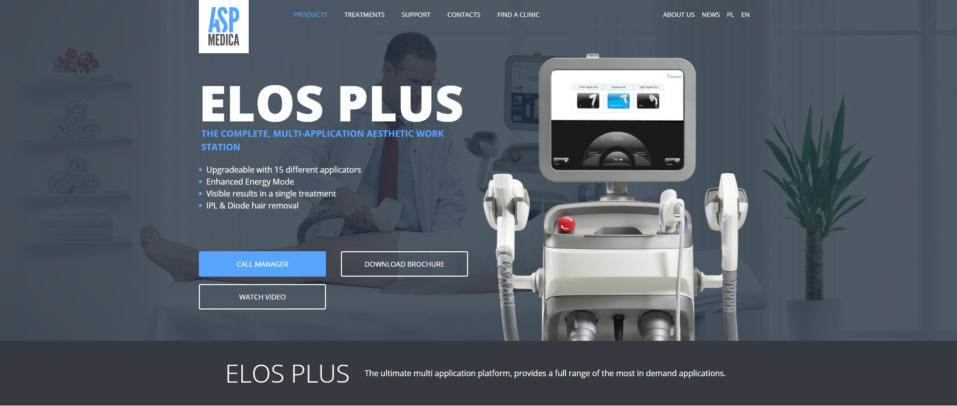 Сайт ASPMEDICA — это комбинация корпоративного ресурса и сайта-каталога. Сайт знакомит посетителя с компанией, раскрывая информацию о ее ценностях и принципах, а также презентует поставляемое оборудование. Все продуктовые страницы реализованы в формате landing page, их смысловые блоки со всех возможных сторон рассказывают о технических характеристиках и преимуществах поставляемого оборудования премиум-класса Syneron-Candela.