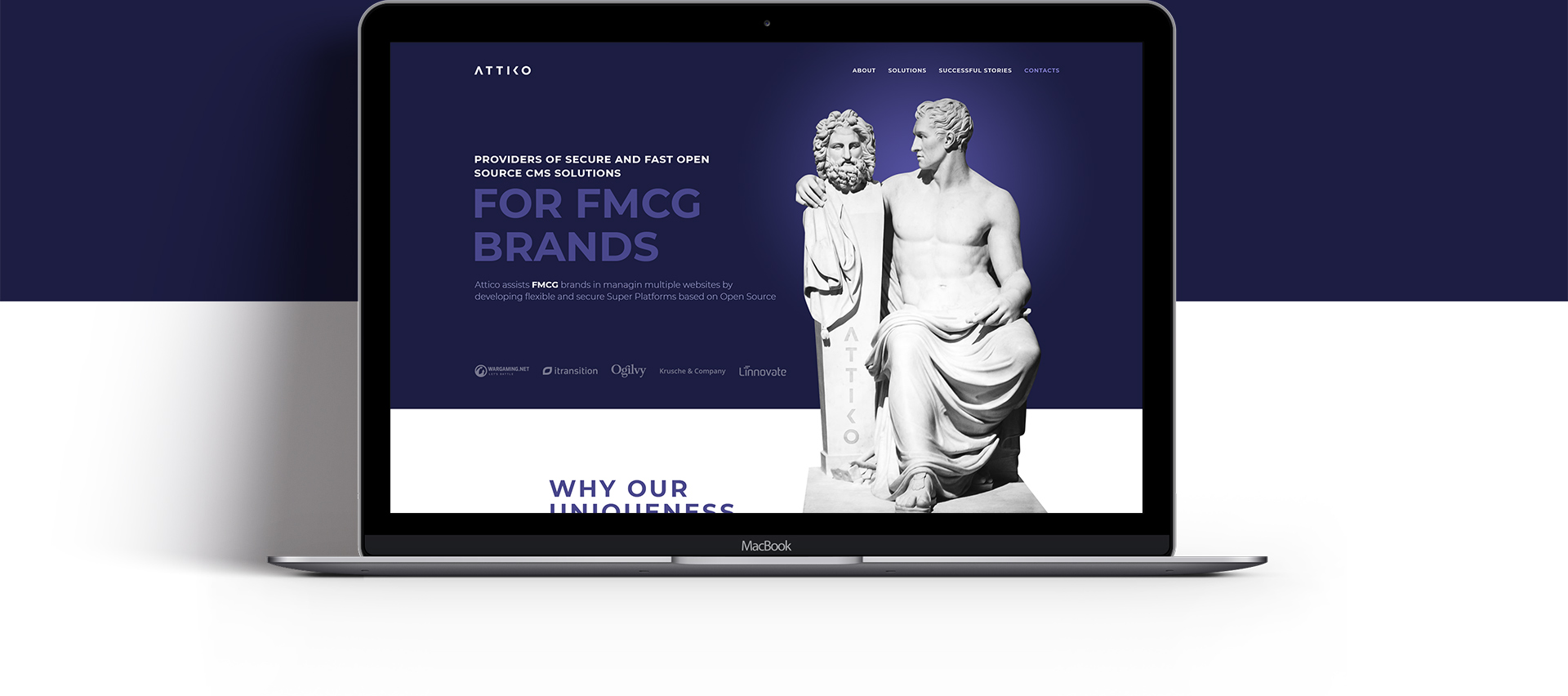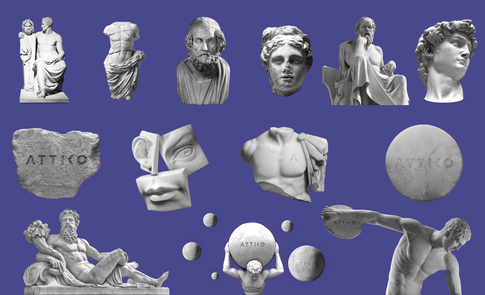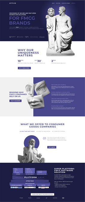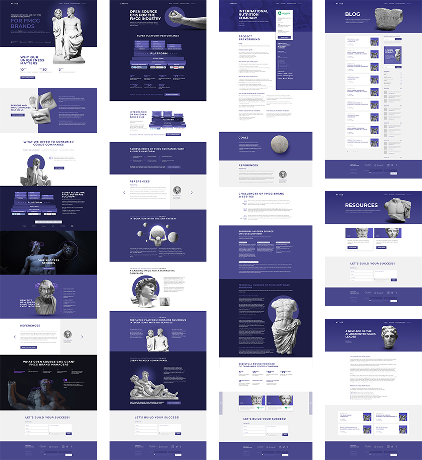 Для каждого смыслового блока мы разработали дизайн фотоматериалов. Сайт Attico — место, где эстет ликует: только взгляните на это невообразимое количество античных скульптур.