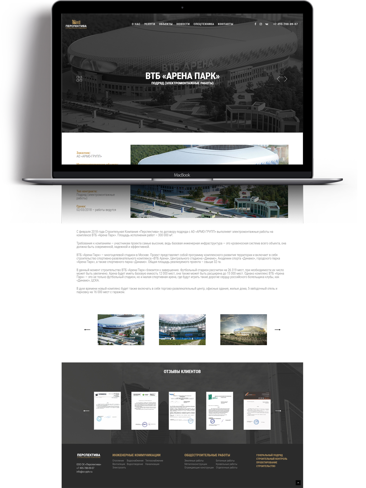 Безусловно, самый весомый и популярный раздел сайта – портфолио. Каждый объект компании презентован на сайте в формате краткой истории, фотогалереи, тезисной информации об объекте. Блок отзывов позволяет оценить удовлетворенность клиентов от полученных услуг.