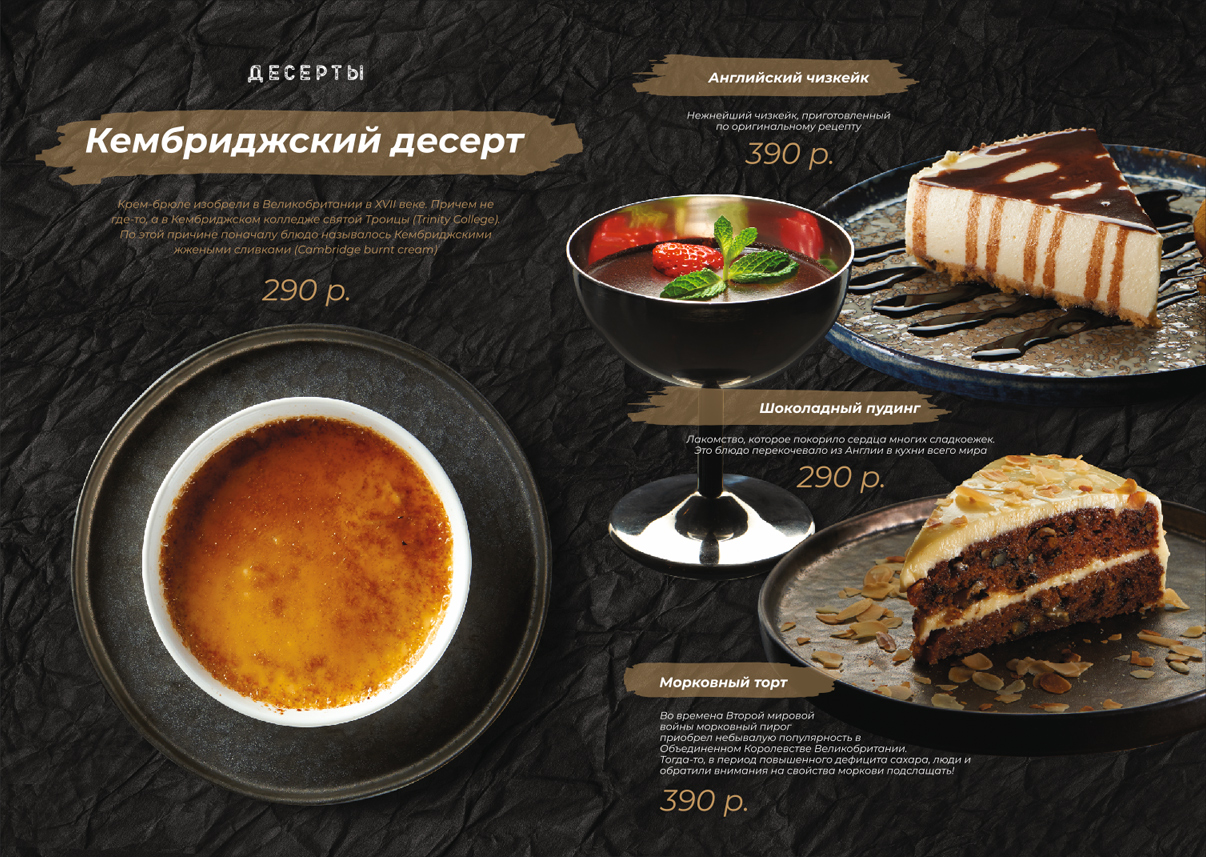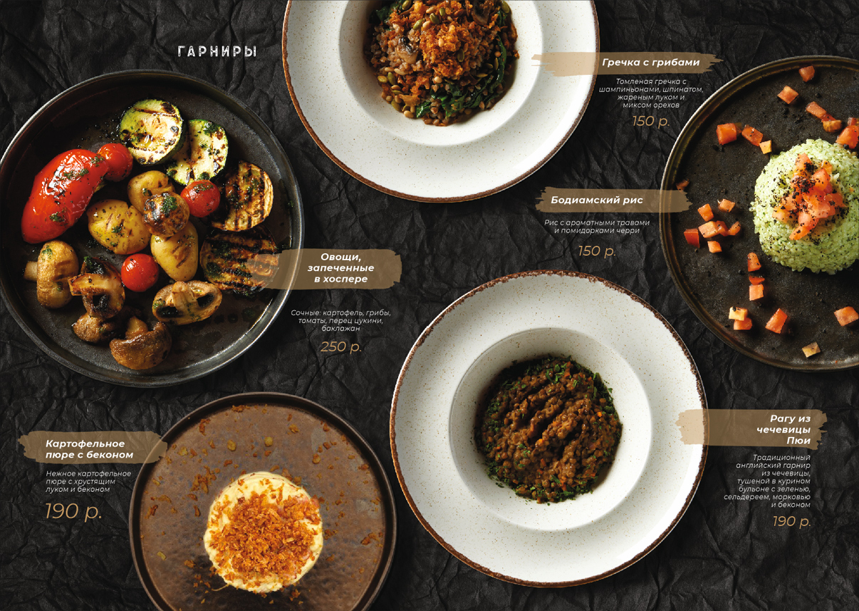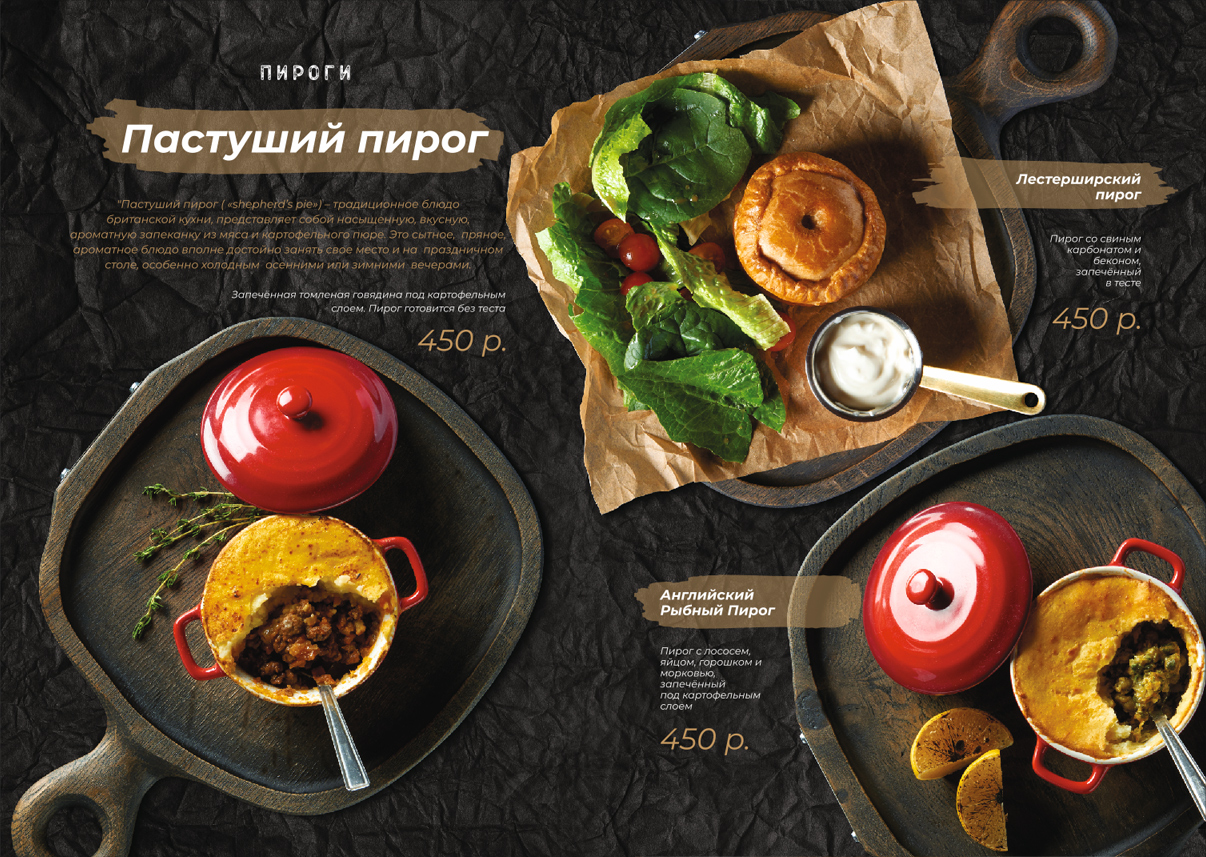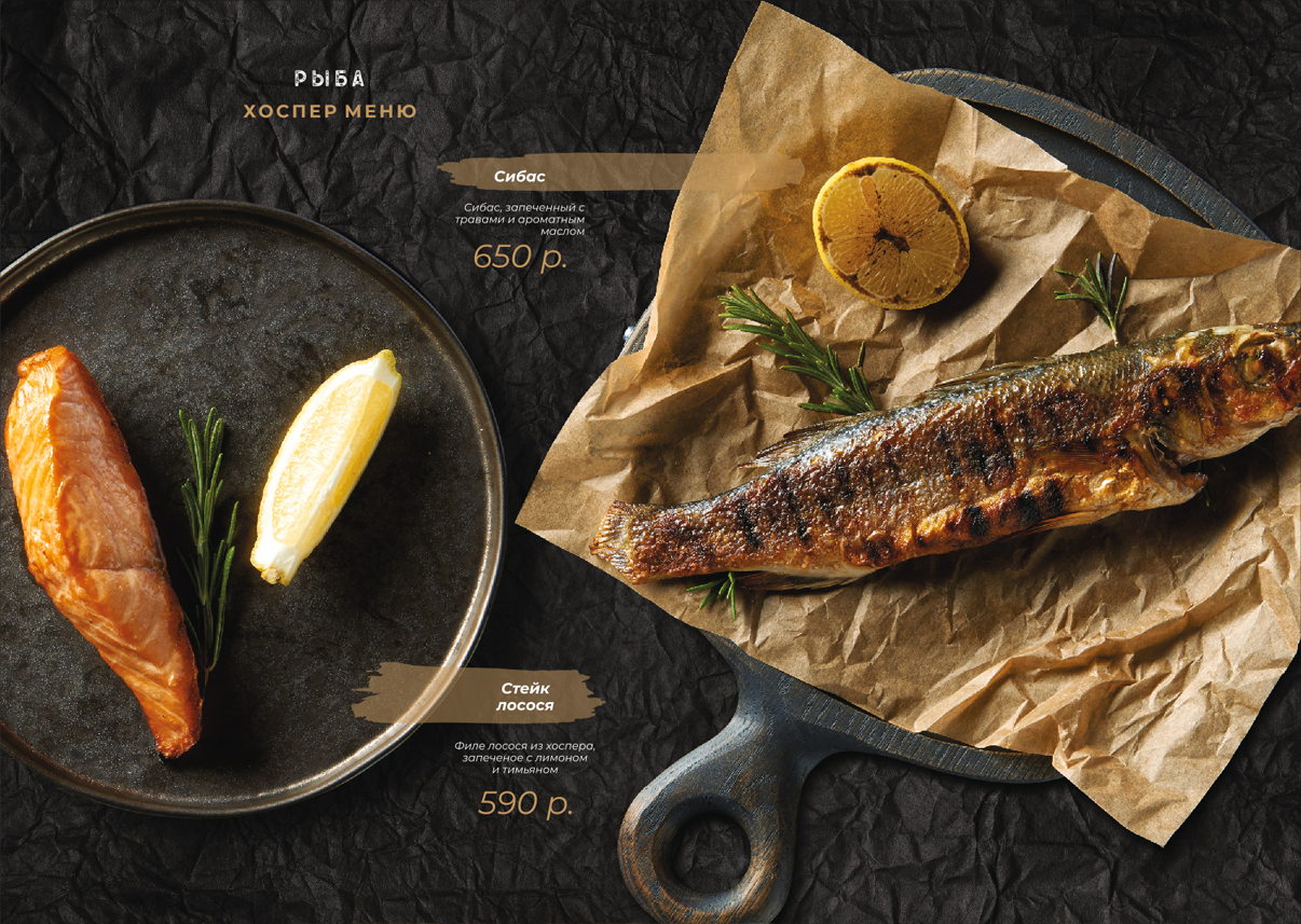 Чтобы обеспечить визуальное единство всех использованных в меню фотоматериалов, снимки прошли предварительную подготовку: изображения блюд были отделены от фона, была произведена цветокоррекция, а также брендирование посуды (там, где это уместно). Фоном меню рестопаба выступила фактура крафтовой бумаги в черном цвете. Такой подход прекрасно передал атмосферу заведения, а также выполнил главную задачу — сосредоточить внимание смотрящего на кулинарных изысках.