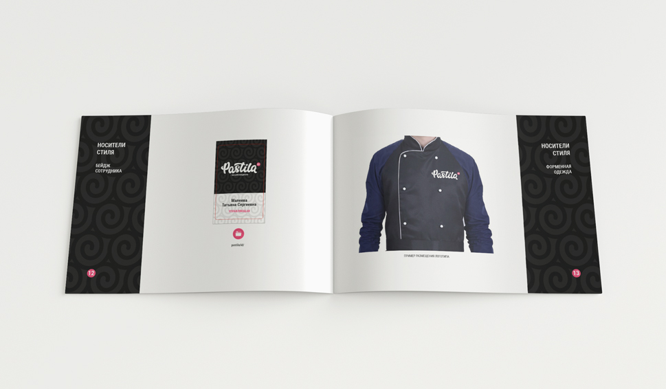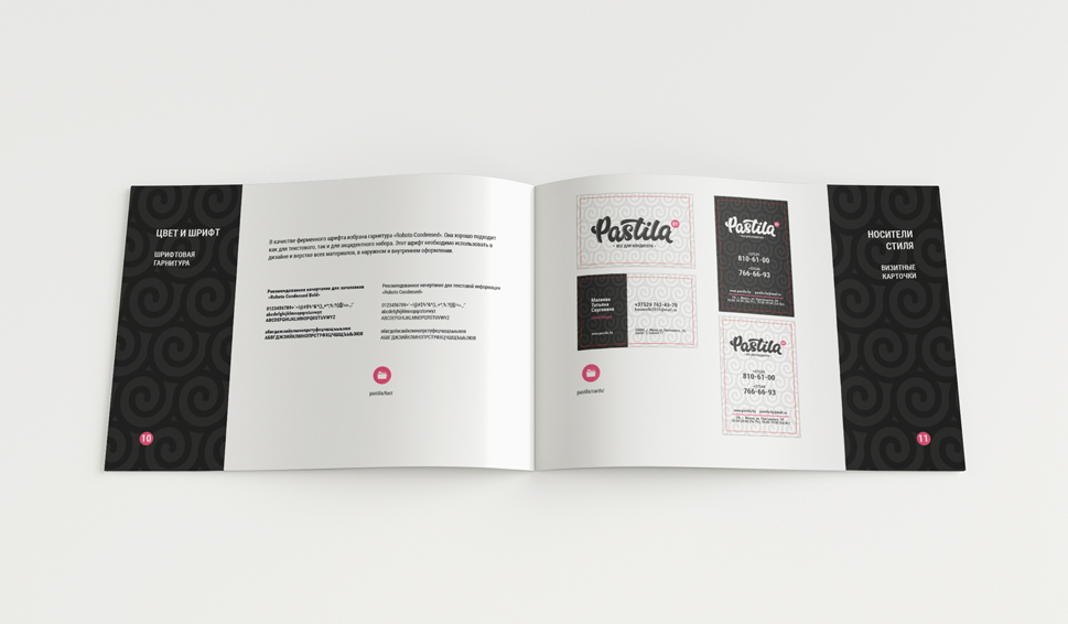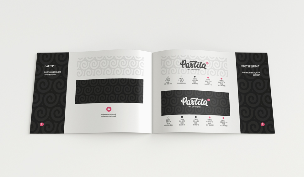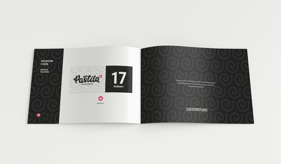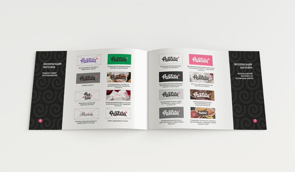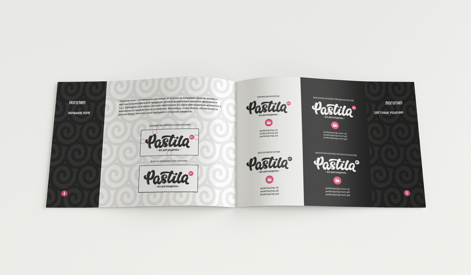 Чтобы фирменный стиль выглядел целостно и выверено, прежде чем приступать к созданию дизайна носителей, в студии была осуществлена работа по формированию логобука Pastila – руководства по использованию базовых элементов айдентики.