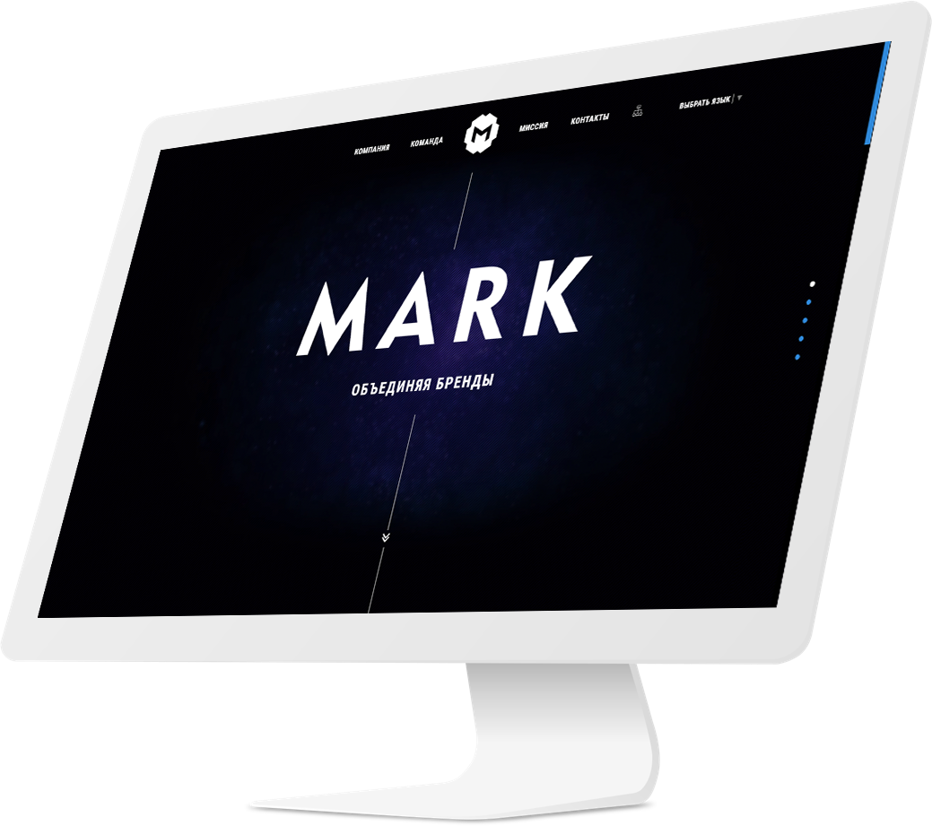 Дизайн главной страницы сайта реализован в формате скролл-экранов, перелистывание которых сопровождается динамикой элементов, а также фоновыми анимациями. MARK — не из «робкого десятка», а потому наше предложение работать в темных тонах было встречено клиентом с энтузиазмом.