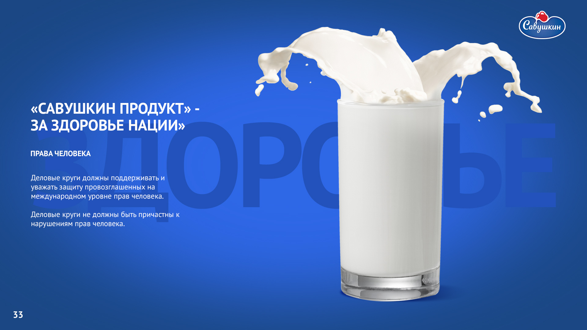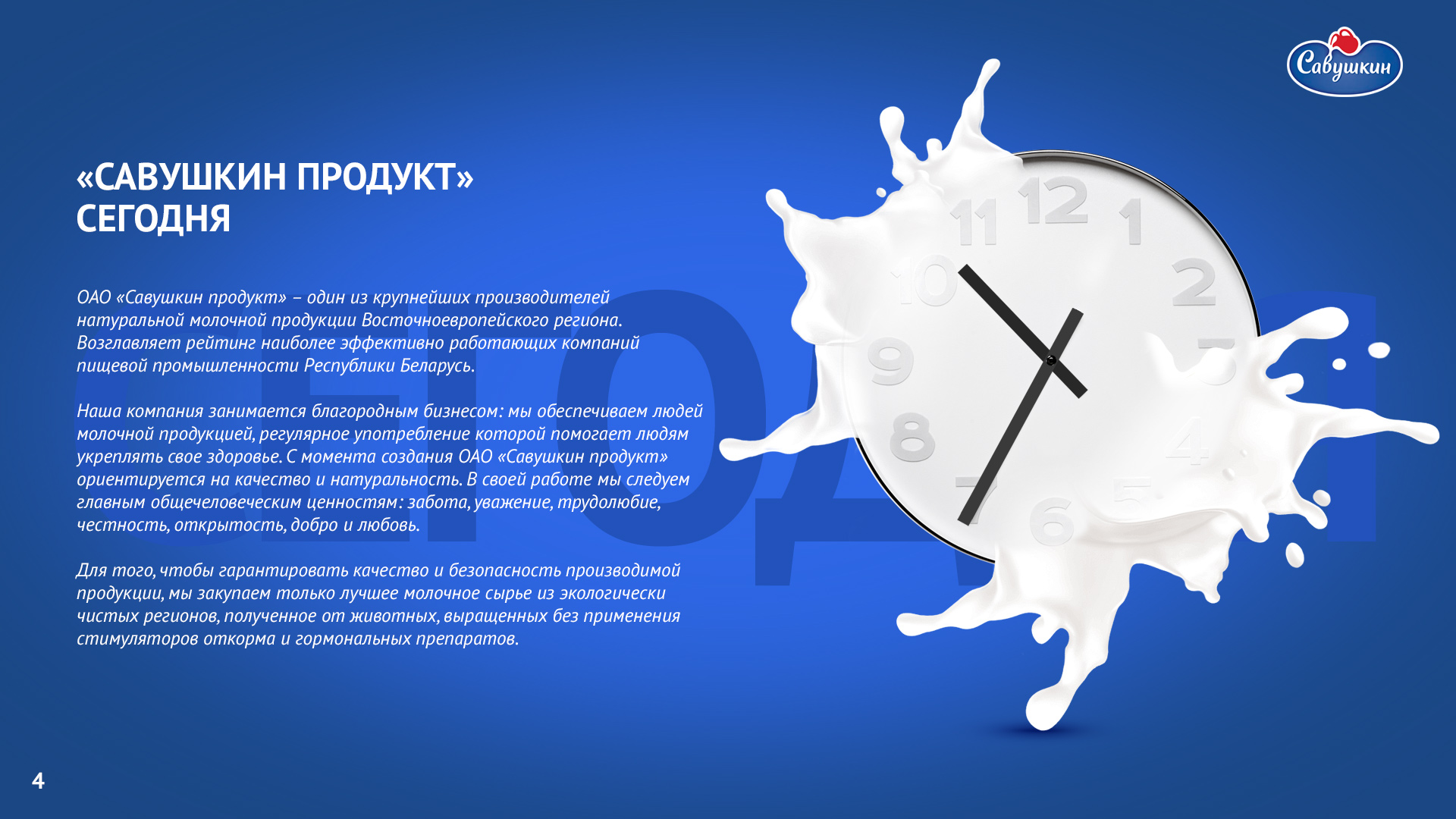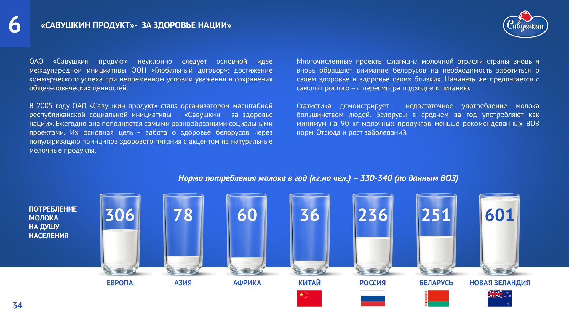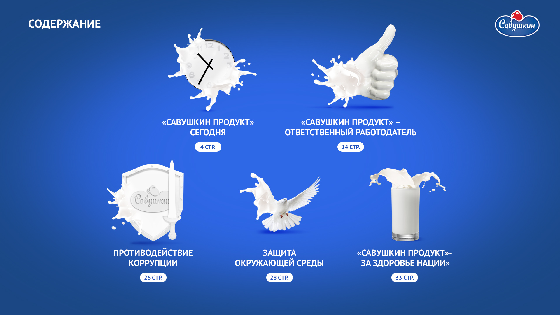 «Савушкин продукт» — безусловный лидер молочной отрасли Республики Беларусь. В 2006 году компания присоединилась к международной инициативе ООН «Глобальный договор», заявив о своей приверженности корпоративной социальной ответственности ведения бизнеса. Ежегодно компания предоставляет отчет о достигнутом прогрессе.