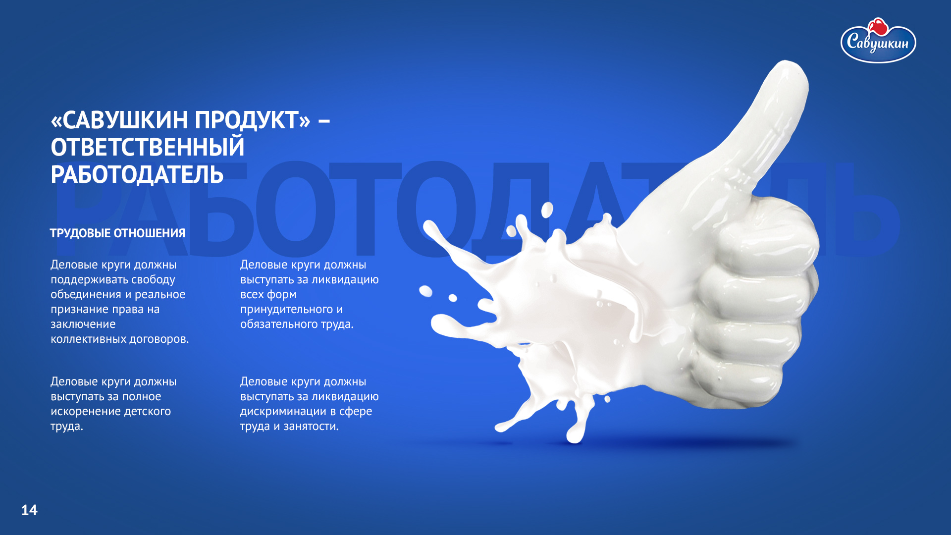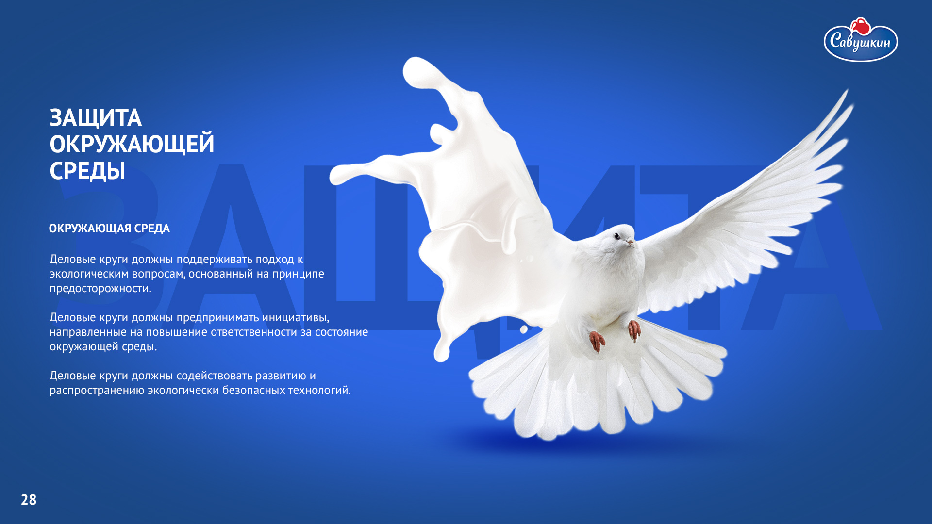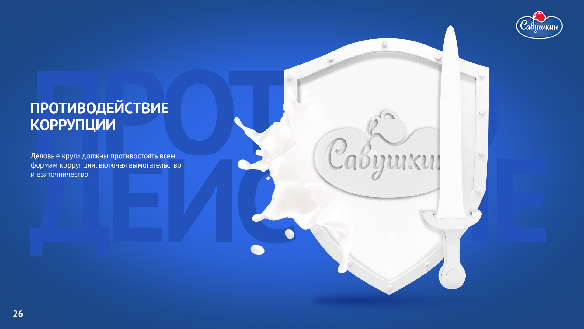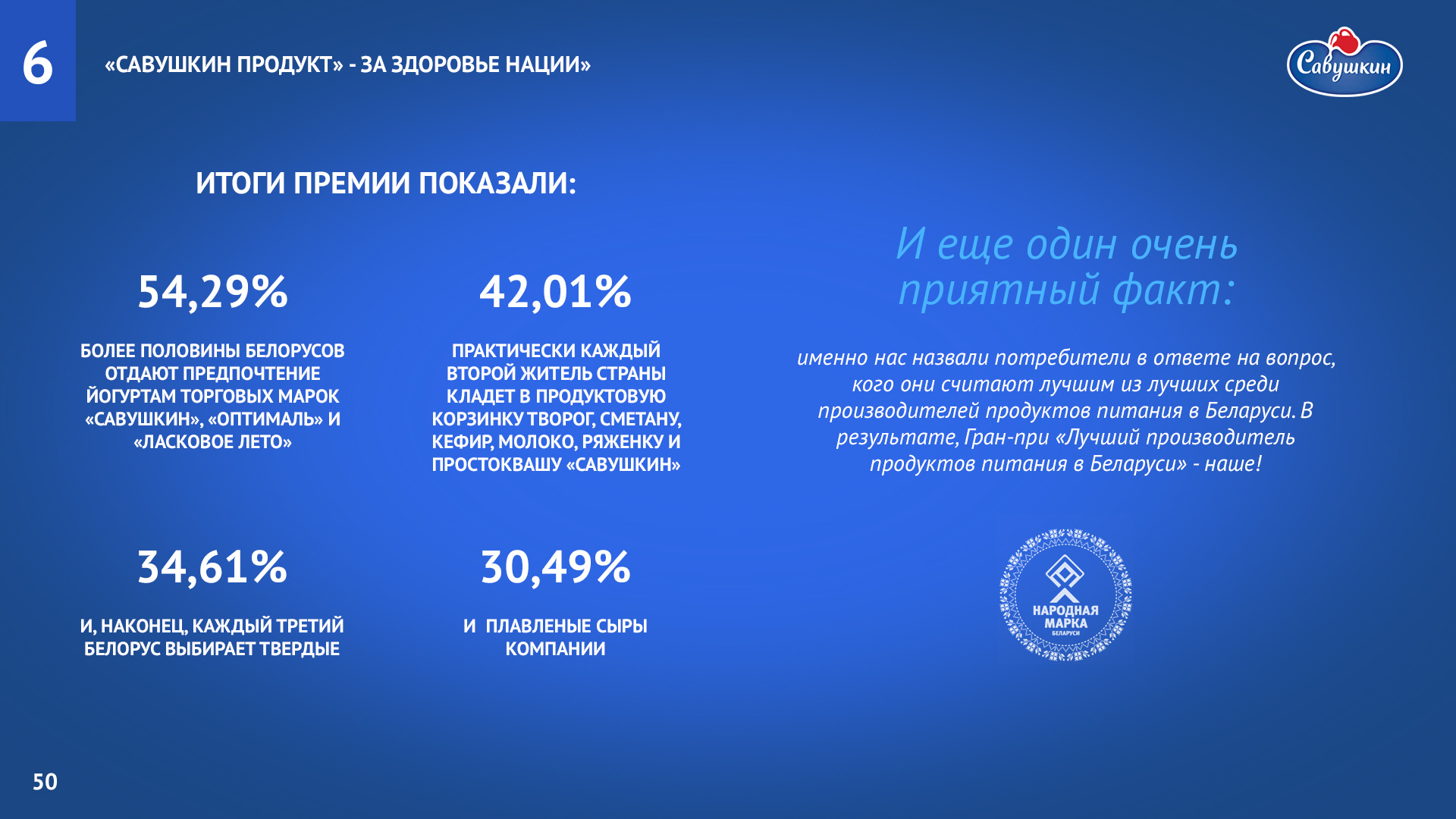 «Савушкин продукт» — безусловный лидер молочной отрасли Республики Беларусь. В 2006 году компания присоединилась к международной инициативе ООН «Глобальный договор», заявив о своей приверженности корпоративной социальной ответственности ведения бизнеса. Ежегодно компания предоставляет отчет о достигнутом прогрессе.
