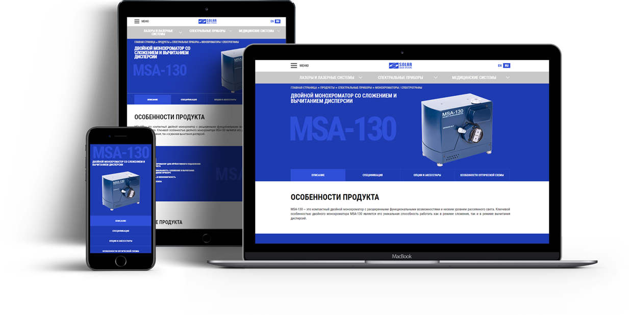 Solar LS — эксперт в области проектирования и производства лазерного оборудования и спектральных приборов. Более четверти века компания предлагает своим клиентам решения в области науки, медицины и промышленности. Редизайн корпоративного сайта был призван упорядочить формат презентации продукции, структурировать транслируемую информацию о Солар ЛС, привести внешнее оформление страниц в соответствие с текущим вектором эксплуатации фирменного стиля компании.