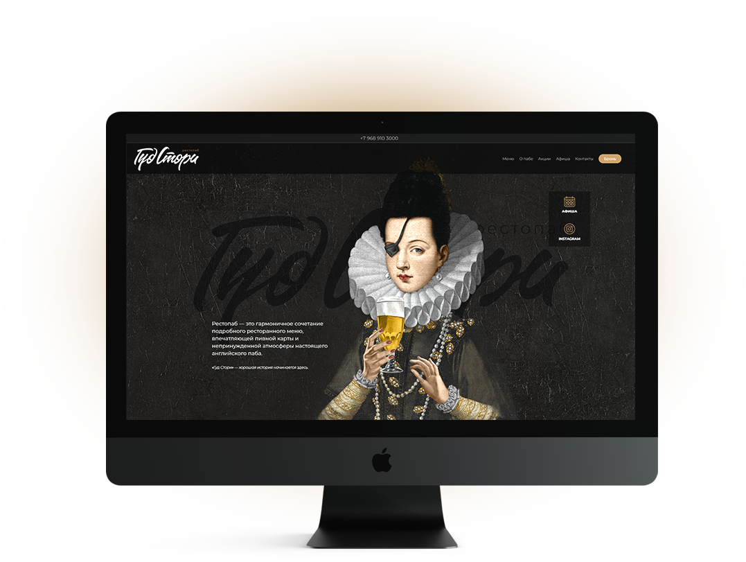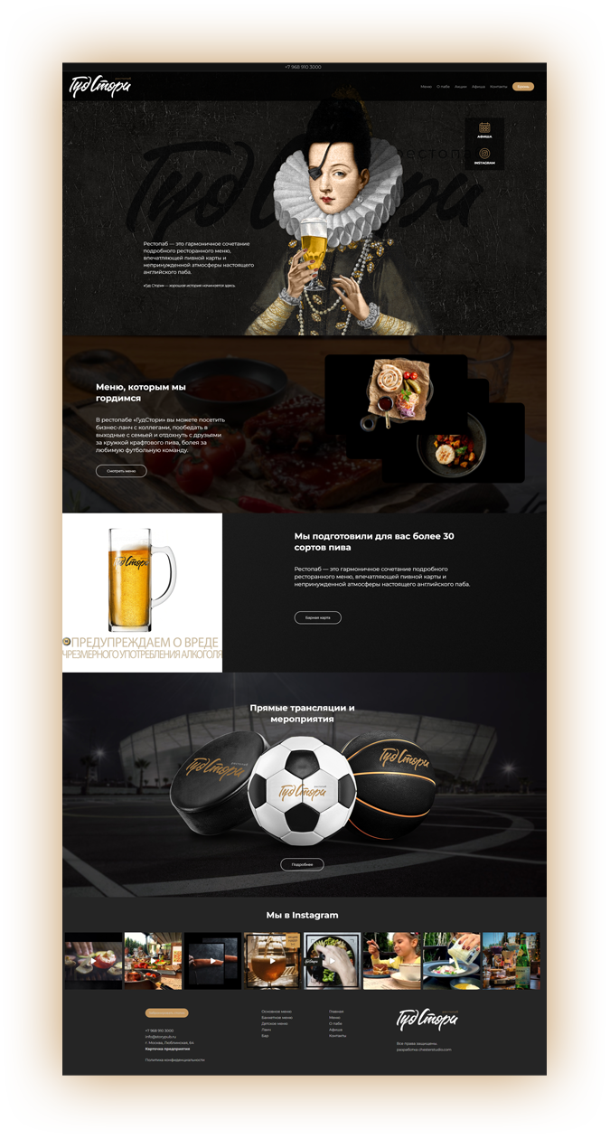 Мы разработали оригинальные иллюстрации, использовали темные тона и минимум текстовых блоков, сделав акцент в дизайне на заголовки. Получилась атмосфера настоящего английского паба, который дает начало множеству хороших историй.
