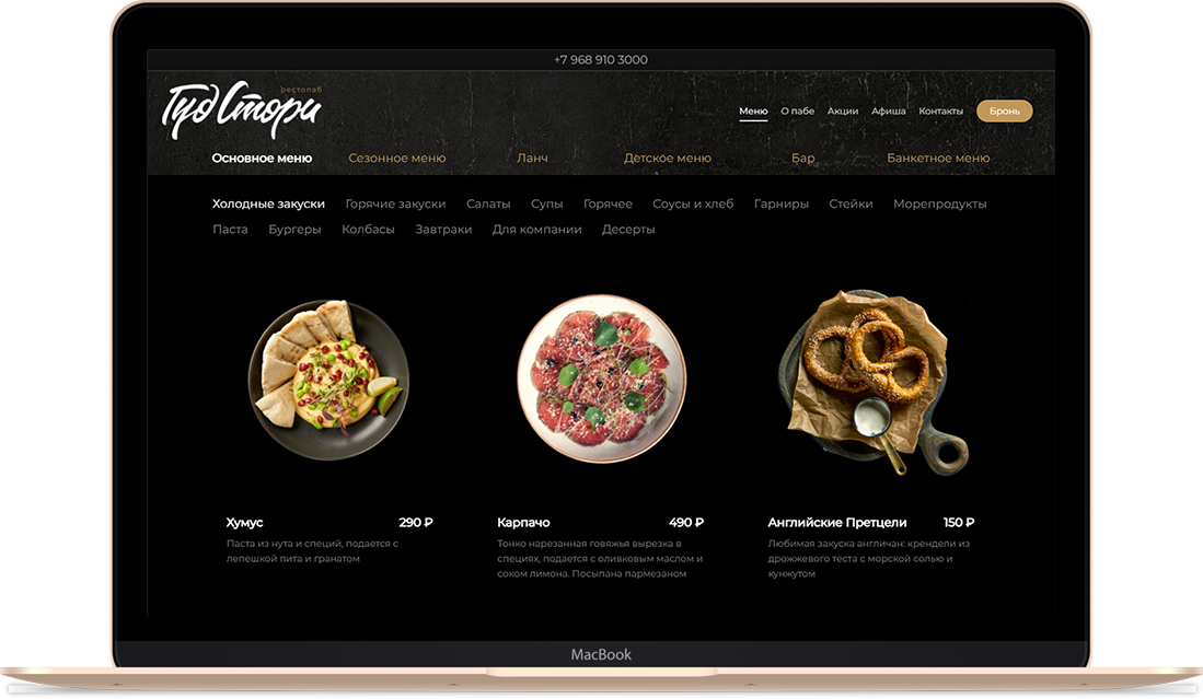 Да, несомненно, самое главное на сайте рестопаба — это меню. Большая работа по подготовке контента себя оправдала: каждое блюдо на сайте выглядит как настоящее произведение искусства. К слову, над печатной версией меню рестопаба мы тоже отлично поработали, но это другая история, которая требует отдельного рассказа.