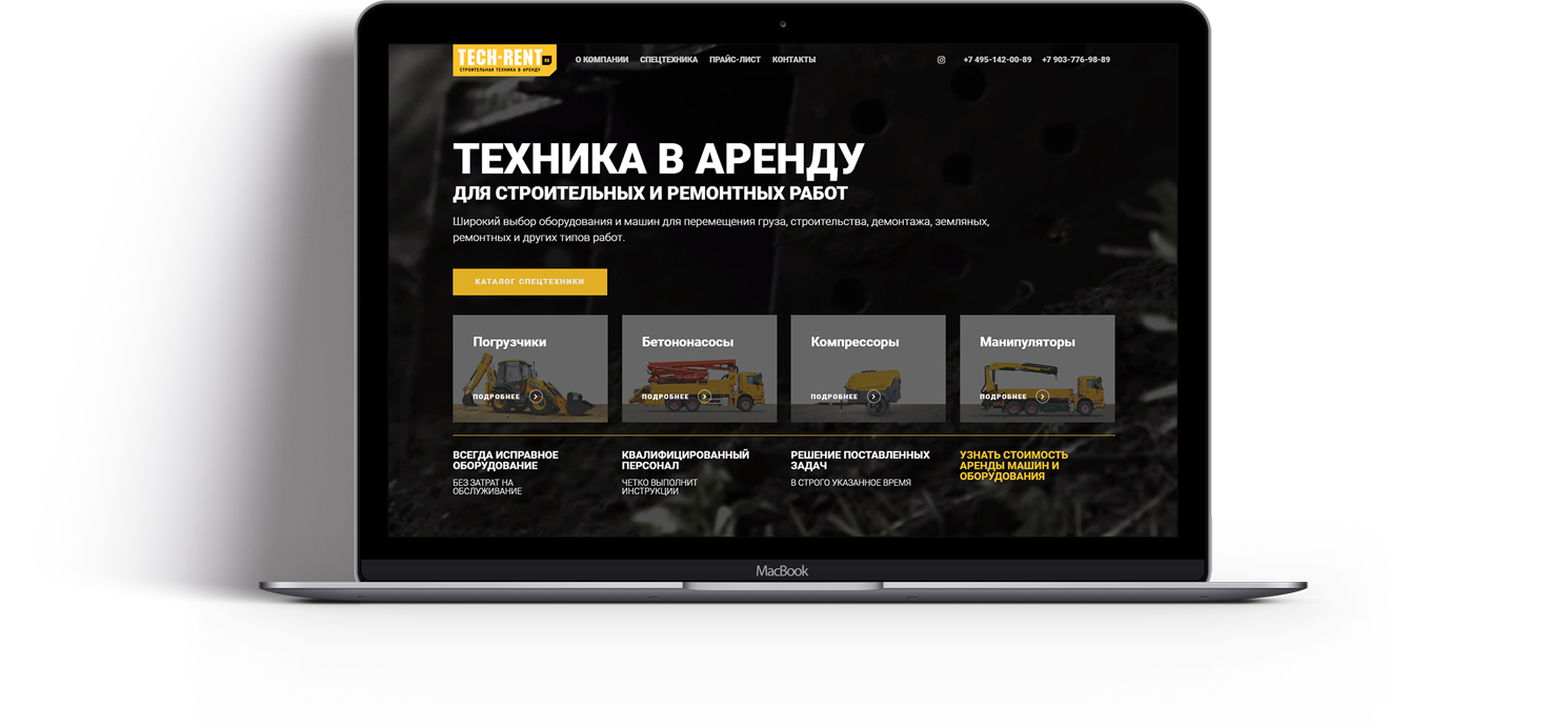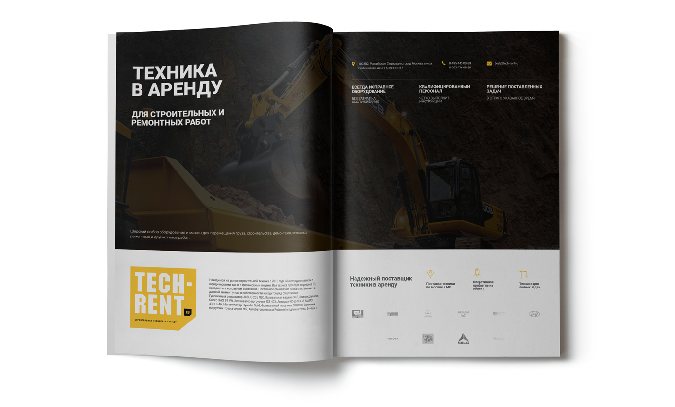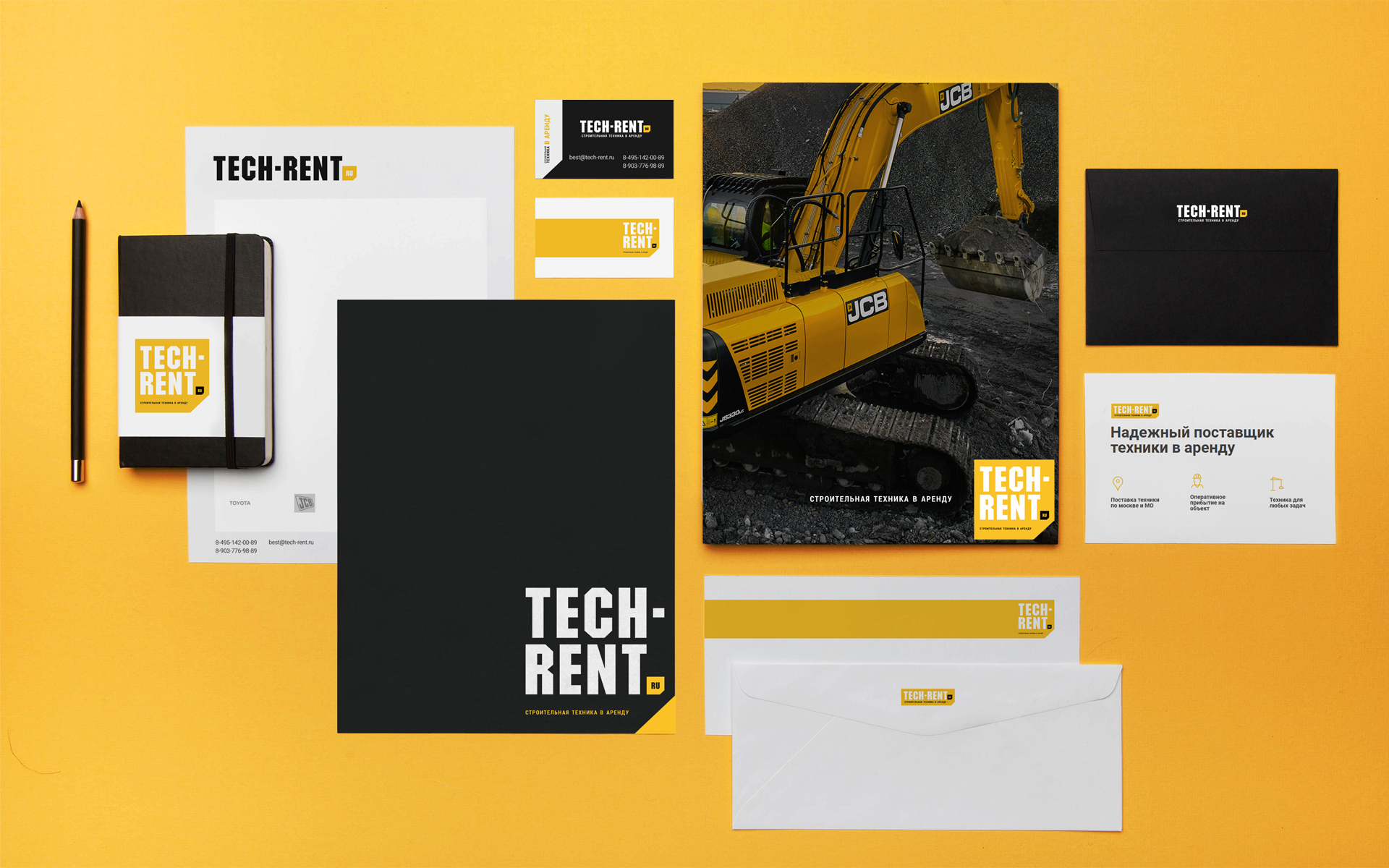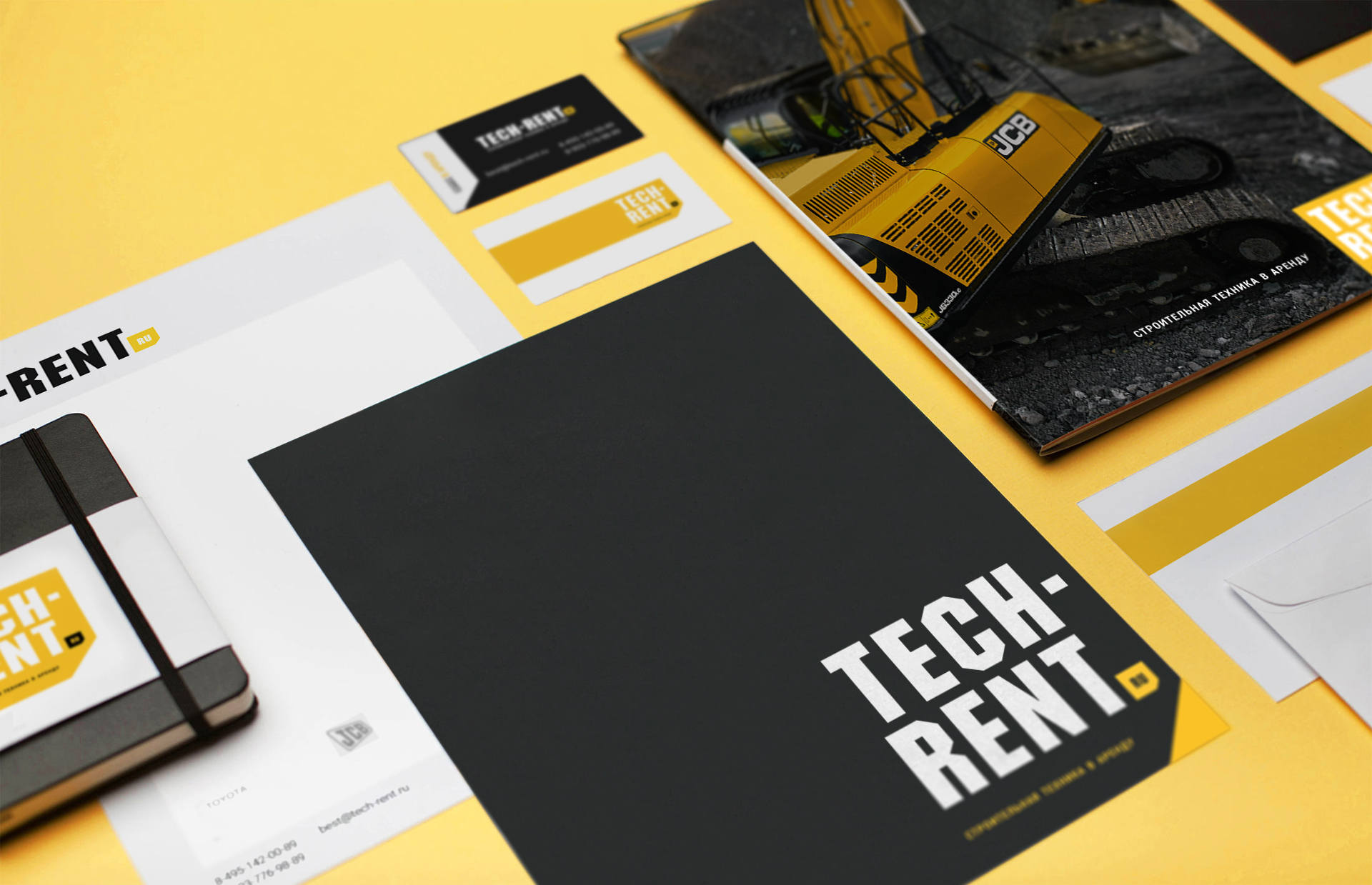 Такие мастодонты, как JCB и Caterpillar сделали черно-желтую цветовую схему традиционной для мира строительной техники. У Tech-rent большой арсенал оборудования и машин, однако, основу ее парка слагает именно JCB. Чтобы логотип компании не выглядел чужеродно в контексте поставляемой техники, клиент пожелал разработать шрифтовый логотип в устоявшейся палитре цветов.
